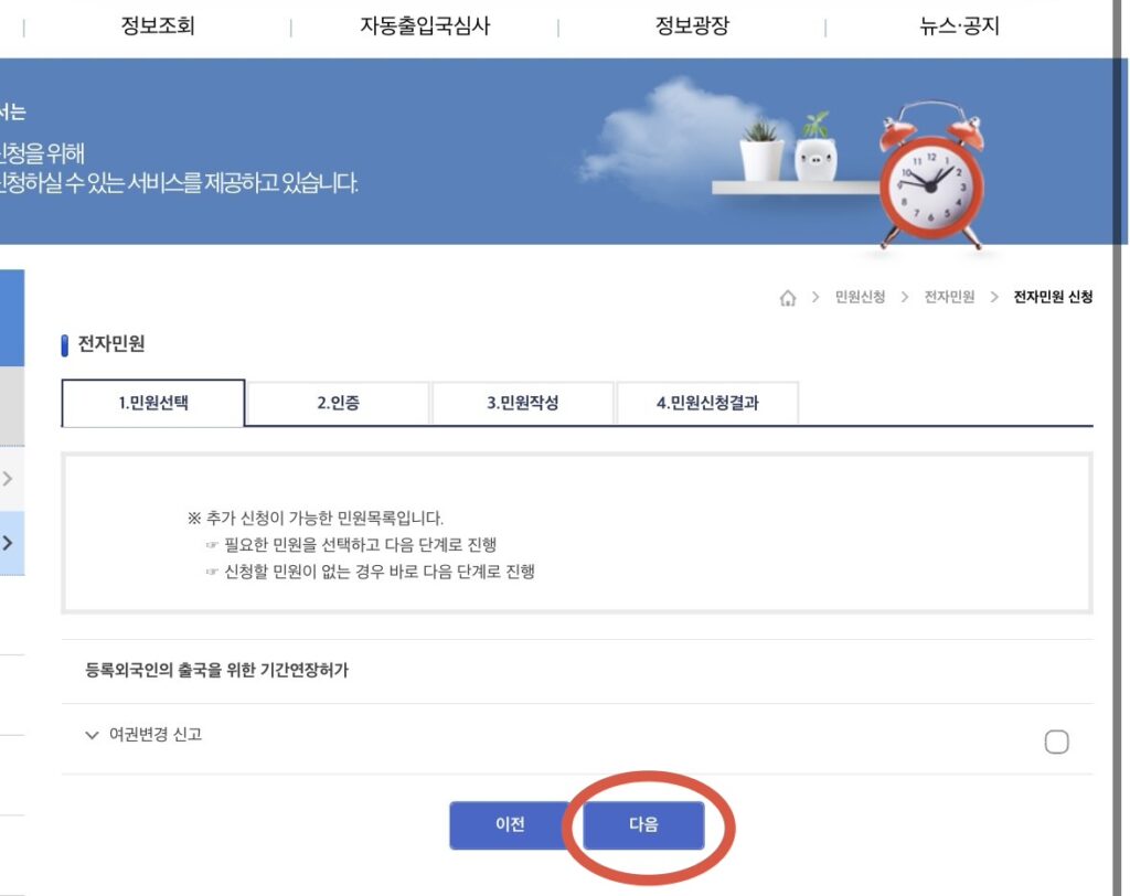④「民願選択(민원선택)」 画面が出てくるので、そのまま 「次へ(다음)」 をクリックします。