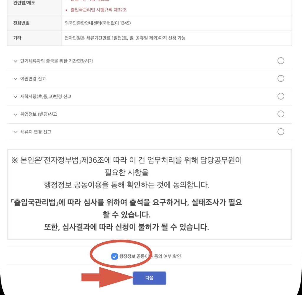 ③「行政情報共同利用同意可否確認(행정정보 공동이용 동의 여부 확인)」 にチェックを入れて 「次へ(다음)」 クリック。