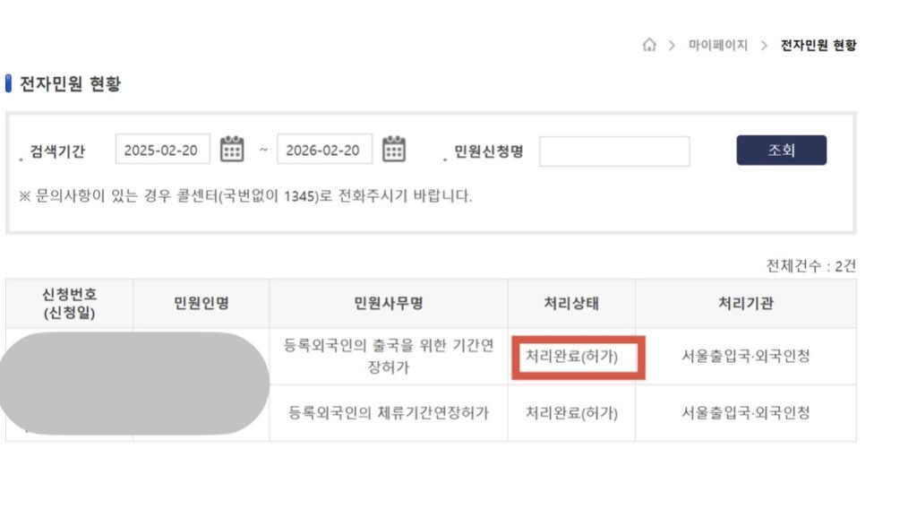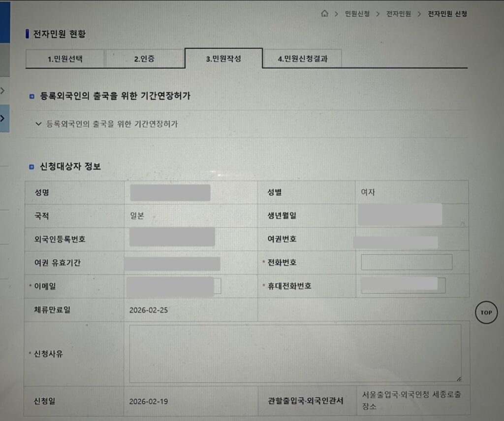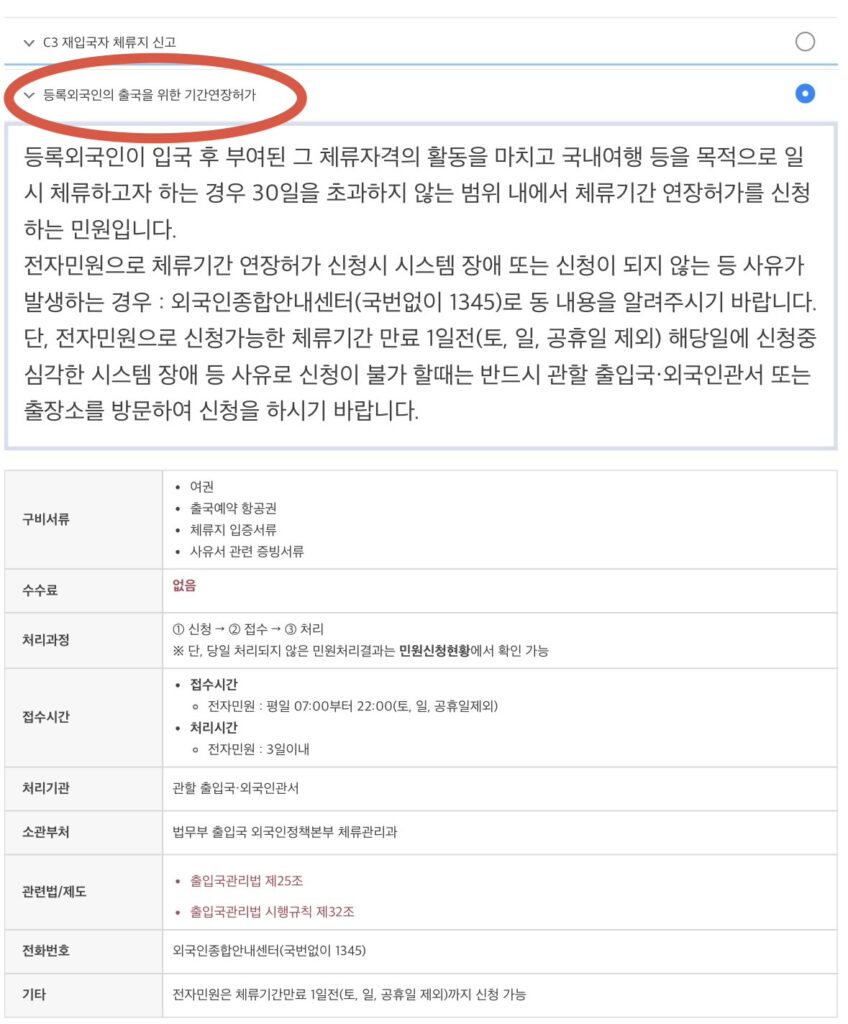 - ②「登録外国人の出国のための期間延長許可(등록외국인의 출국을 위한 기간연장허가)」 を選択