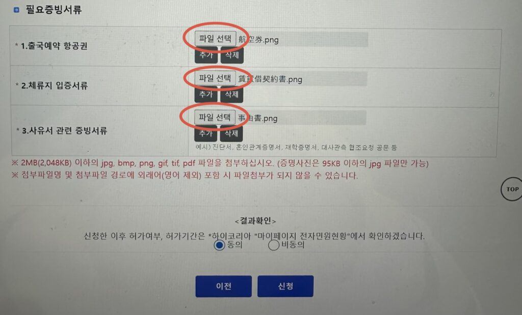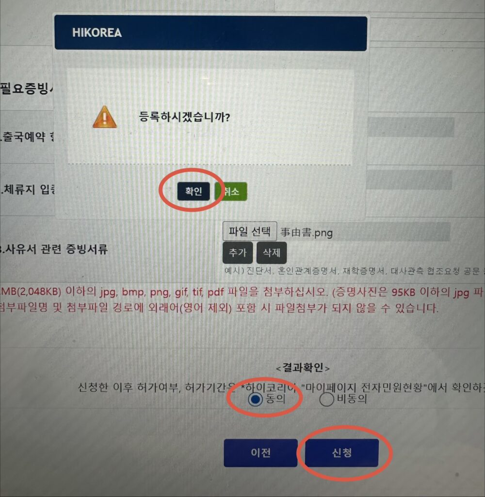 ⑨最後に「結果確認(결과확인)」に「同意(동의)」にチェックして「申請(신청)」をクリック