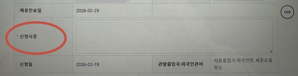 ⑥「申請事由(신청사유)」 を入力します。