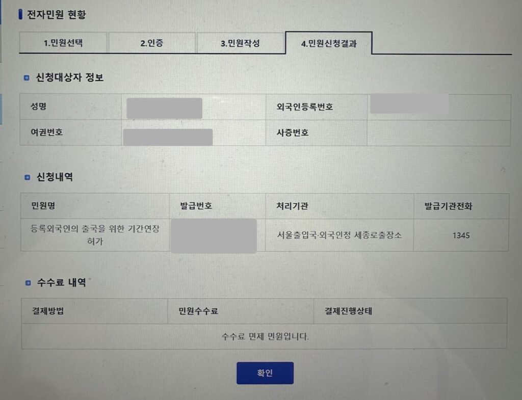 「申請後の許可の可否や許可期間は、マイページの電子民願現状から確認します」というポップアップが出てくるので、「確認(확인)」を押します。